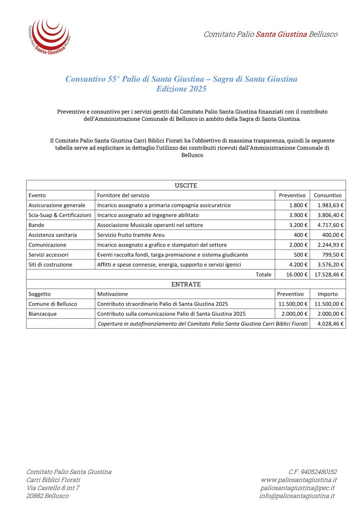- Anno 2025 – Nel periodo 1 gennaio – 31 dicembre, il Comitato Palio Santa Giustina Carri Biblici Fiorati ha ricevuto dal Comune di Bellusco questi contributi: